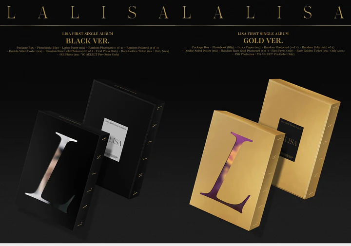 LISA FIRST SINGLE ALBUM LALISA 는 리사가 직접 디자인에 참여한 패키지박스, 포토북, 랜덤 엽서, 랜덤 폴라로이드 등으로 풍성하게 구성되었으며, 초도한정으로 랜덤 레어 골든 포토카드와 레어 골든 티켓이 포함되어 있어 소장가치를 높였다.
