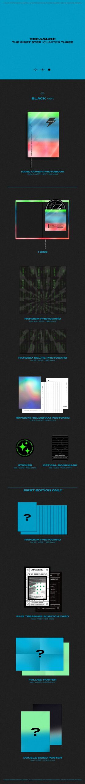 TREASURE 3rd Single album [THE FIRST STEP : CHAPTER THREE]는 구성품 이미지가 다른 WHITE ver.과 BLACK ver. 총 2종으로 발매되며 오는 10월 27일부터 예약판매를 시작하여 11월 13일 YG셀렉트를 비롯 전국 온/오프라인 음반 매장에서 만나볼 수 있다.